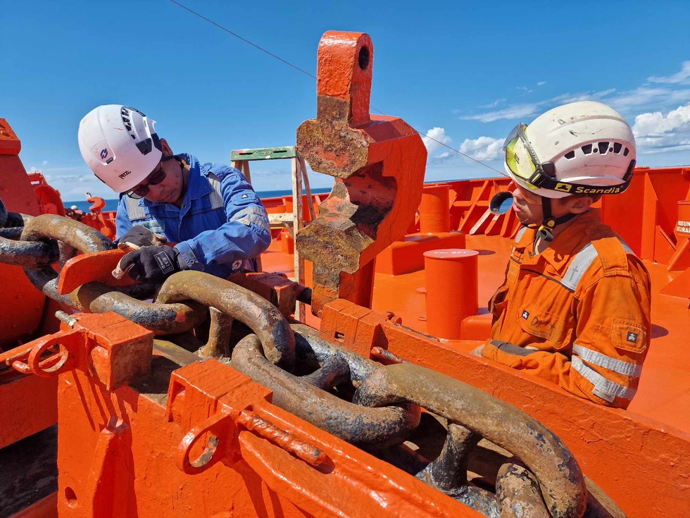 Training time. Bosun Edwin Gumaya shows deck trainee Fredrik Haugstvedt how to adjust the anchor chain stopper. Photo by Christian Dahl.