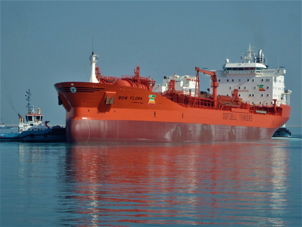 We sit and chat in the shade in the harbor while we wait for the taxi boat that will take us out to the chemical tanker Bow Flora. It is Sunday morning. The wind flowing through the windows of the taxi boat feels good. Odd Arne is Port Captain for Odfjell and is underway for a ship visit.