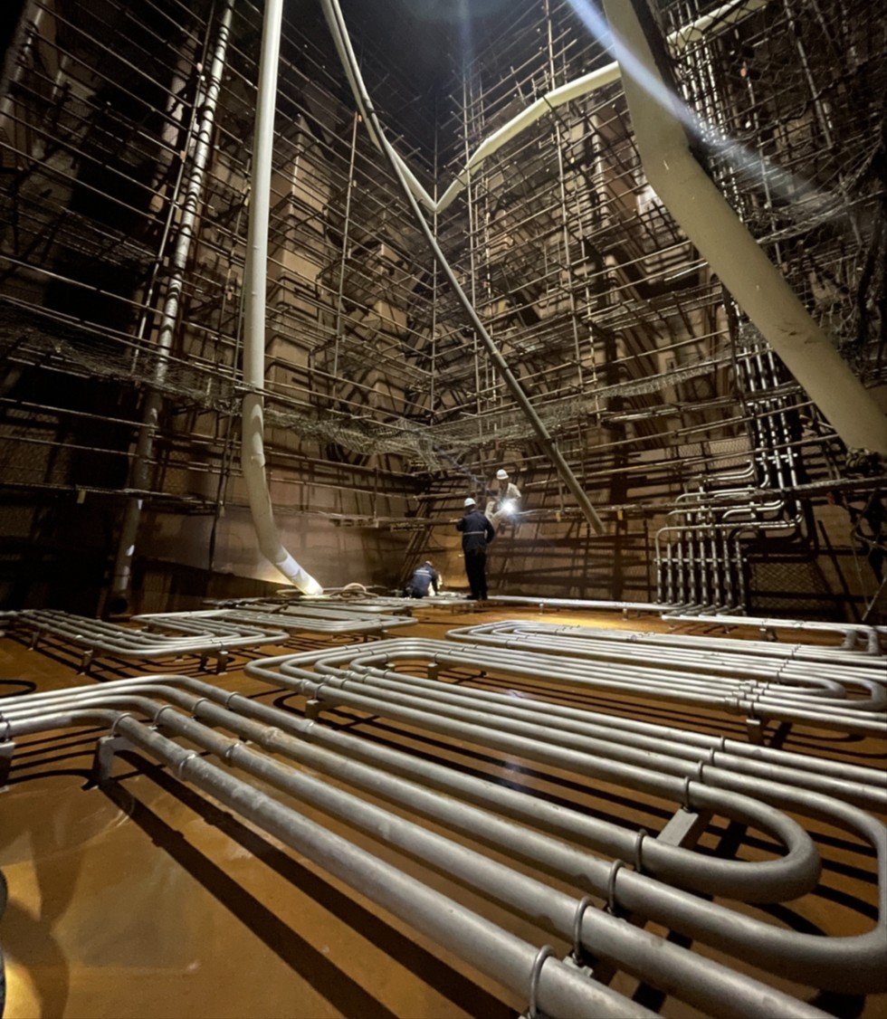 This coating upgrade project is complex in many ways. When you’re inspecting over 28,000 square meters of tank surface, searching for remnants of old coating or microscopic defects, sometimes smaller than the eye of a needle, you begin to grasp the discipline and attention to detail needed to prepare for this high-performance coating,” Christopher comments.