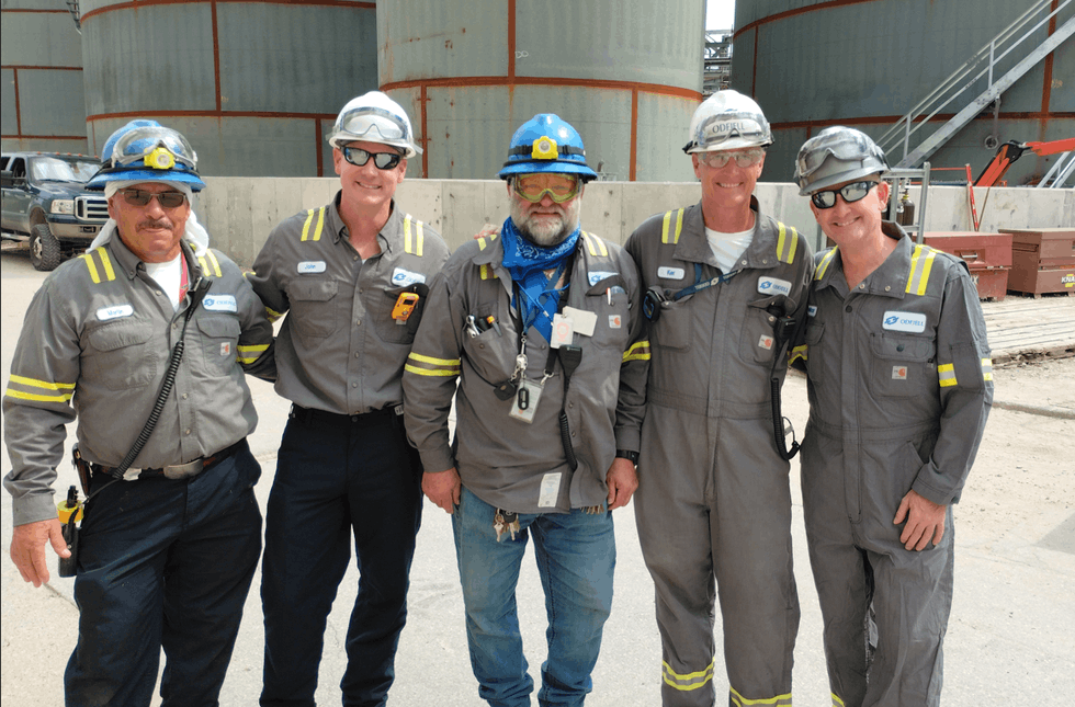 An experienced team: Sr. Millwright Martin Mondragon Sr., Senior I&E Technician Roman Makosa and Project Manager Ken Zoeller have each worked for more than 30 years at Odfjell Terminals Houston. Here with CEO John Blanchard (second from left) and Chair Laurence Odfjell (right).