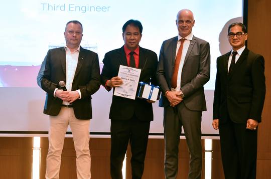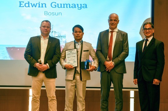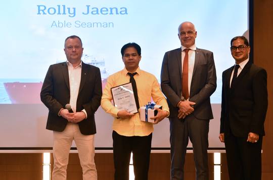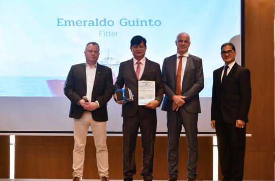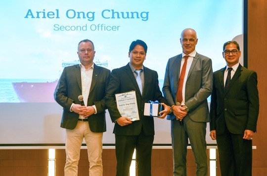 Chief Technical Officer Torger Trige, VP Maritime Personnel Svend Foyn-Bruun and Odfjell Philippines, Inc. General Manager Captain Remigio Zamora presented the plaque and gold watch to the following awardees: